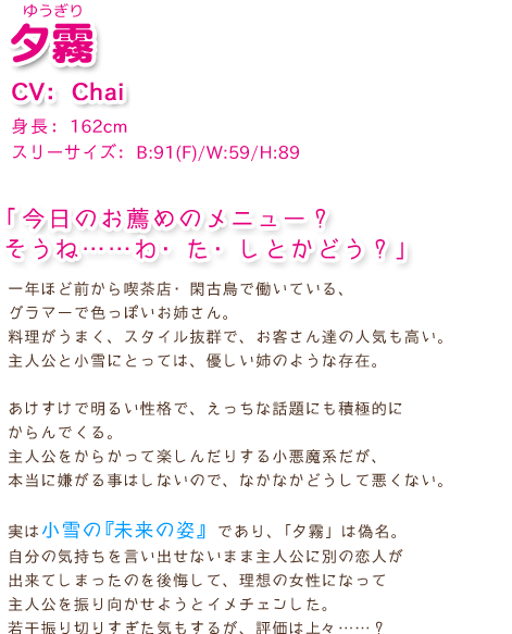 原画:あにぃ / 大田優一 / 悠樹真琴  シナリオ:北川晴 / 明日希  BGM:Peak A Soul+